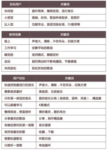 需要說明的是,休閑型、小資型、達人型用戶雖然有區(qū)別,但他們之間并不是**獨立和互斥的關(guān)系,他們的一些使用場景和用戶目標甚至是重合的,比如休閑型和小資型用戶可能都有分享音樂的需求。因此在發(fā)散使用場景和用戶目標時,不需要太受人群類型的限制。"放” 得越寬,“收”的時候才越有選擇余地,越不會遺漏重要內(nèi)容。