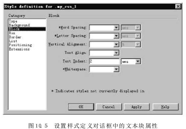 在圖10.4所示對(duì)話框的"Category"列表框中,選擇"Block" 項(xiàng),出現(xiàn)"Block"設(shè)置面板,設(shè)置mycss_1樣式的屬性,如圖10.5所示,單擊“OK" 按鈕。在如圖10.2所示的CSS樣式面板上將出現(xiàn)新定義的樣式my-css_1.